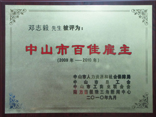 2010年9月13日下午2:00,中山市2010年度百佳雇主頒獎(jiǎng)典禮暨“同是中山建設(shè)者”百佳流動(dòng)務(wù)工人員評(píng)選活動(dòng)啟動(dòng)儀式在市文化藝術(shù)中心大劇場(chǎng)舉行。伴隨著現(xiàn)場(chǎng)近千名觀眾的熱烈掌聲,由中山市人力資源和社會(huì)保障局、中山市總工會(huì)、中山市工商聯(lián)以及南方日?qǐng)?bào)珠三角新聞中心共同舉辦的“中山市首屆百佳雇主”評(píng)選結(jié)果正式揭曉,我司在眾多申報(bào)企業(yè)中脫穎而出,獲“中山市首屆百佳雇主”殊榮。