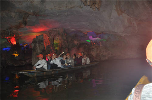 鏡頭一:賞過(guò)風(fēng)景如畫的鼎湖山,我們來(lái)到了盛名遠(yuǎn)傳的七星巖。七座形態(tài)各異的山峰,八個(gè)壯觀非凡的巖洞,移步換景之間,我們都不由得驚嘆于這里的每一處神秘。小艇輕游在龍巖洞的腹中暗河上,裹身于石壁鐫刻與溶洞奇景,頗有世外桃源之境。