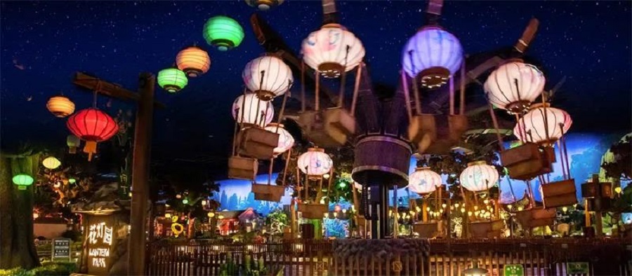 功夫熊貓蓋世之地屬于北京環(huán)球影城獨有,燈影傳奇也是國內(nèi)首創(chuàng)的設(shè)備。這一設(shè)備最大的特點是中國傳統(tǒng)文化跟現(xiàn)代游樂的相互融合,設(shè)備既有傳統(tǒng)建筑的元素,也有傳統(tǒng)燈籠的造型,燈籠上還有經(jīng)典的皮影戲元素;通過這些,把傳統(tǒng)文化以一種動態(tài)的體驗呈現(xiàn)給游客。為了還原中國復(fù)古燈籠的造型和效果,我們從燈籠骨架的設(shè)計、布料的選型、圖案的印刷工藝、縫制工藝到燈光的變色控制等,都經(jīng)過了反復(fù)的測試和改良,其中燈籠布料的選材既要求布料潤澤有質(zhì)感,又要經(jīng)久耐用能承受長期的張力,還要彈性軟硬適中不能起一絲皺褶,為此我們經(jīng)歷了6輪試制與測試,反復(fù)改良工藝,力求每個細節(jié)都能完美展現(xiàn)中國傳統(tǒng)燈籠的效果。