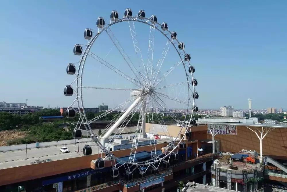 GLC-52A觀覽車是中山金馬自主研發(fā)的觀覽車類游藝機。整個產(chǎn)品由塔架、主軸、轉(zhuǎn)盤、吊廂、驅(qū)動系統(tǒng)組成。塔架由2根立柱構(gòu)成,分布在轉(zhuǎn)盤一側(cè),整個轉(zhuǎn)盤呈懸臂梁結(jié)構(gòu),在塔架支撐的基礎(chǔ)上增加鋼索固定。主軸水平布置,主軸上的轉(zhuǎn)筒隨著設(shè)備運行而轉(zhuǎn)動。轉(zhuǎn)盤采用桁架式結(jié)構(gòu),轉(zhuǎn)盤上均勻地分布著30個吊廂,每個吊廂最大乘客量6人。游客乘座吊廂沿轉(zhuǎn)盤運行,體驗著觀光賞景的樂趣;新穎獨特的懸臂結(jié)構(gòu),再配以明麗變幻、動感迷人的燈飾,別具匠心的現(xiàn)場配景,以及柔美動聽的背景音樂,使得本設(shè)備深受游客的歡迎,也是一個重要的城市地標。