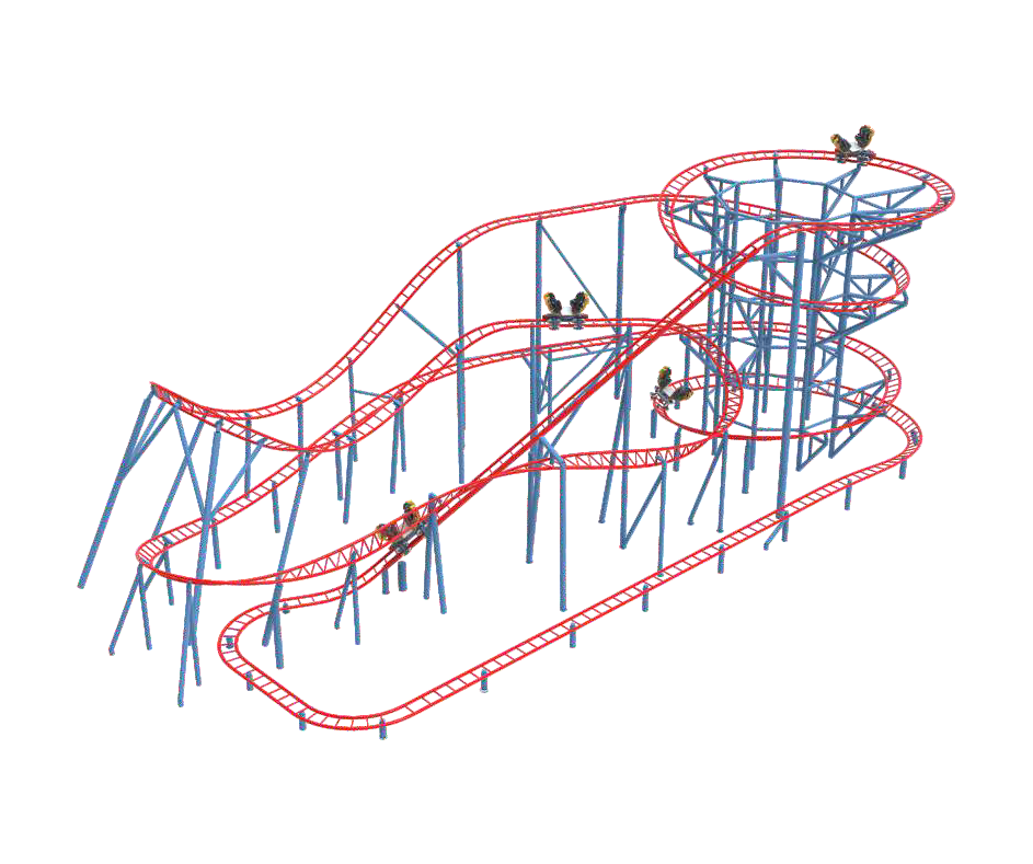 超炫過山車結(jié)合720°螺旋下降、水平螺旋環(huán)的運(yùn)動方式,配合自轉(zhuǎn)回旋車體,同時創(chuàng)新地將過山車有傾?的路軌引到自旋滑車的軌道中,打造出兼具失重、超重和回旋的多重乘坐體驗。四人座車體中,游客兩兩對坐,互動交流有趣。該設(shè)備適合親?、情侶群體游客游玩。