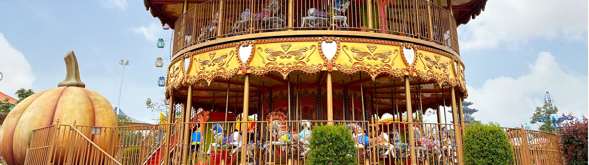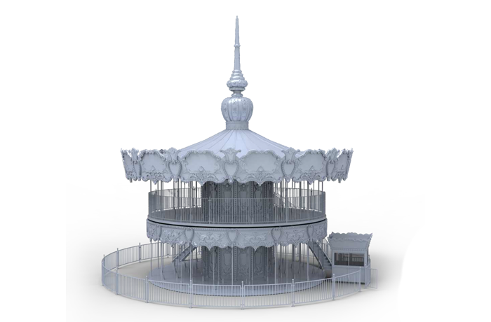 豪華雙層轉(zhuǎn)馬是上、下層可單獨(dú)作旋轉(zhuǎn)運(yùn)動(dòng)的裝飾豪華的轉(zhuǎn)馬,采用歐洲皇家的古典豪華的裝飾風(fēng)格。蓬頂?shù)幕使诩馑睕_云宵,天花板、內(nèi)圍板鑲嵌著彩色浮雕,并配備彩燈。馬匹及宮庭式馬車(chē)結(jié)合多彩的花飾,造型奢華大氣流光溢彩。