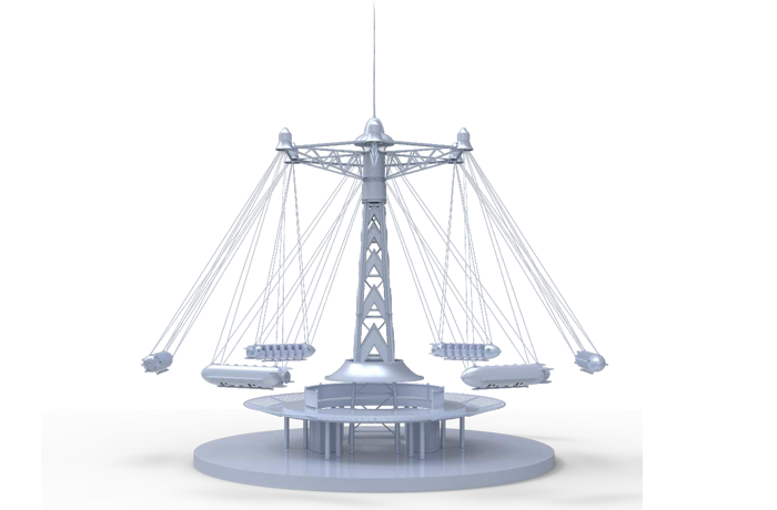幻速追影六個(gè)飛機(jī)吊掛座艙隨同旋轉(zhuǎn)架相對(duì)塔體自由旋轉(zhuǎn)并外擺升起,繞中心立柱飛行,科幻又刺激。夜間智能燈光系統(tǒng)亮起,成為樂園一道的奇趣風(fēng)景線。