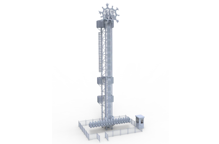 跳躍云霄以跳躍為主題,十六座座艙沿著豎直的立柱軌道作上升、下降和連貫的跳躍運(yùn)動(dòng),使乘客在超重與失重的過程中體驗(yàn)到跳躍樂趣。