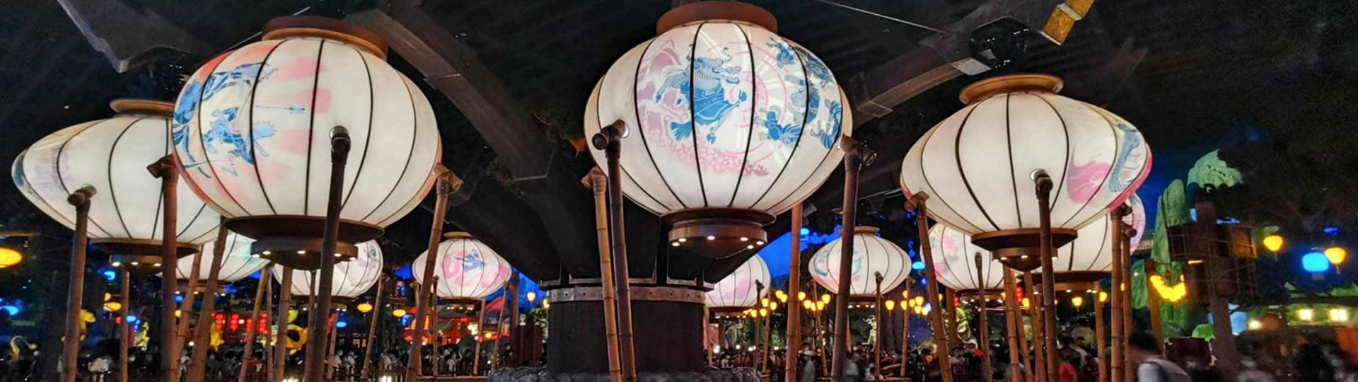 逍遙花燈集旋轉(zhuǎn)、升降運動形式于一體。在運行過程中,轉(zhuǎn)盤會以15°的傾?進(jìn)行旋轉(zhuǎn),乘客在吊籃中邊體驗離心力作用下的外擺及高低起伏的回旋飄蕩,邊欣賞燈籠光影變幻下的皮影故事。