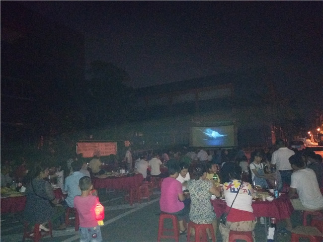19:00,隨著夜幕降臨,本次活動(dòng)的重頭戲也即將開(kāi)始:戶外觀影《戰(zhàn)狼2》。在一旁的放映工作人員搭建好放映幕布、調(diào)試好放映燈光等設(shè)備后,一束射燈穿透黑暗,電影正式開(kāi)始。前一秒還在熱烈交談、縱享美食的座上賓們頓時(shí)安靜了下來(lái),目光不約而同地投向了大屏幕;一旁的小孩也不再繼續(xù)搗騰手中的燈籠,而是提著小燈籠歡快地跑到幕布最前方,如圖平日上課般安靜且認(rèn)真地融入了這片視覺(jué)與聽(tīng)覺(jué)齊體驗(yàn)的氛圍中。